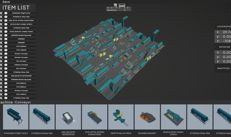We developed a Unity-based program to help a recycling company plan their facilities. Throughout the project, we worked as both 3D Artists and Game Developers, and we managed the entire process. Understanding the client's needs and planning the work was also our responsibility. We re-modeled over 60 machines from STL files into game-ready assets. For some machines, we performed retopology to optimize them for the game engine. Additionally, we designed a modular conveyor system based on the client's requirements and modeled it in Lego-like blocks to fit the required scenarios. Optimization was crucial in this project, as the program was designed to set up a facility within a scene. As a result, model quality also had to be optimized. My role in the project has been completed, though the development part is still ongoing.