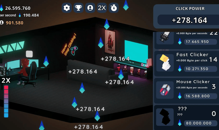 In the web-based game Streamer Clicker, I created all 3D models, characters, environment, and visual assets. To achieve optimal performance for web, I developed high-poly scenes in Blender, rendered them, and then replicated the scene setups in Unity, using characters and interactive props in 3D. This approach allowed us to reach a high level of optimization through a strategic blend of 3D and 2D elements.